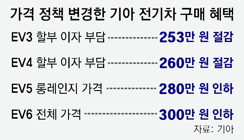 기아는 또 다른 전기 SUV인 EV5 롱레인지 모델의 판매가도 기존 가격에서 280만 원 낮췄다. 가격 인하 이후 가장 기본 트림(에어)은 4575만 원, 최고가 트림(GT라인)은 5060만 원이다. EV5 스탠더드 모델은 이날 출시됐는데 3000만 원대에 살 수 있도록 가격이 책정됐다. 판매가 4310만∼4813만 원으로, 보조금을 적용하면 실구매가가 3400만 원대로 하락한다. 기아는 차량을 살 때 0% 금리 할부와 인증중고차 판매 시 신차 할인 등의 혜택도 주기로 했다.
