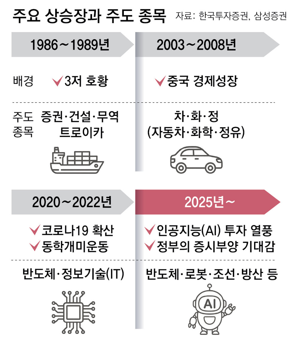 그동안 한국 증시의 성장에는 각 시대를 이끈 산업군이 있었다. 1980년대 후반에는 3저 호황(저금리·저유가·저달러)에 힘입어 건설, 무역회사들이 수출 주도의 성장을 이끌었다. 이들이 ‘한강의 기적’을 이뤄내며 코스피는 1989년 처음으로 1,000을 넘어서며 네 자릿수 시대를 열었다.