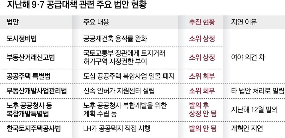 지난해 9·7 주택 공급대책 관련법 10건 중 8건 이상이 국회 국토교통위원회 문턱조차 넘지 못하면서 주택 공급이 지연될 수 있다는 우려가 나온다. 정부가 1월 말 후속 공급대책 발표를 목표로 하고 있는 상황에서 주택 공급에 속도를 내기 위해선 관련법 제정·개정으로 뒷받침할 필요가 있기 때문이다. 주택 공급과 관련된 법안은 민생 법안인데도 국회와 정부가 주택 공급 확대를 위한 기초 작업도 제때 하지 못하고 있다는 비판이 제기된다.