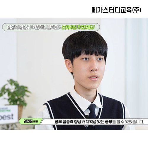 엠베스트의 김민준 회원은 “스윗타임을 자주 활용하면서 공부에 대한 집중력이 높아지고 계획적으로 학습할 수 있게 됐다. 학습 시간을 체크하며 친구들과 경쟁하는 환경에서 공부할 수 있는 점이 좋았고, 실시간 모니터링으로 학습 태도까지 관리가 되니 혼자 공부하는 능력도 많이 길러졌다”고 전했다.
