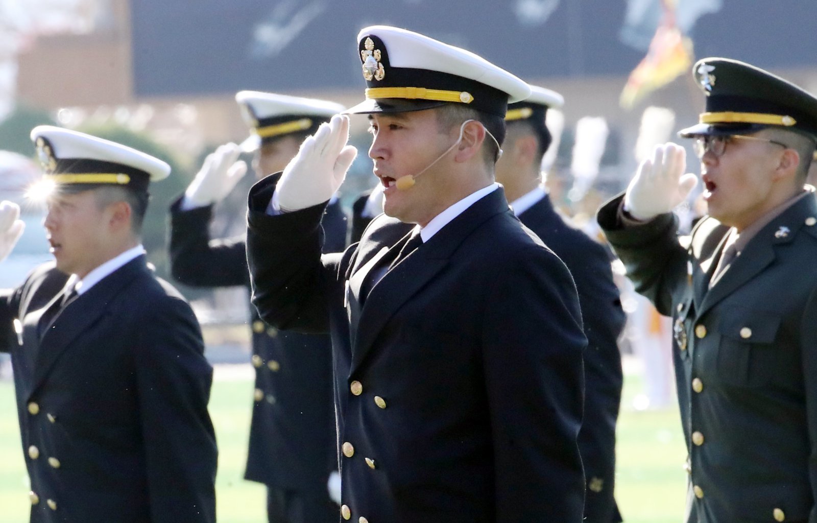 이재용 삼성전자 회장의 장남 이지호 소위가 28일 경남 창원시 진해구 해군사관학교 연병장에서 열린 제139기 해군 해병대 사관후보생 수료 및 임관식에서 경례하고 있다. (공동취재) 2025.11.28 뉴시스