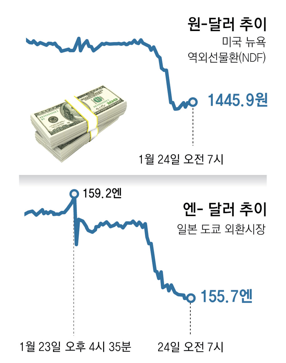 미국과 일본 정부가 엔화 약세를 막기 위한 외환시장 개입을 준비하고 있다는 전망이 퍼지면서 엔-달러 환율이 24일 오전 7시 전날 주간 거래 종가 대비 1.7% 하락(엔화 가치는 상승)했다. 지난해 7월 이후 6개월 만에 가장 큰 폭으로 떨어졌다. 엔-달러 환율이 하락하자 원-달러 환율도 미국 뉴욕 역외선물환(NDF) 시장에서 24일 오전 7시(한국 시간) 1445.9원까지 떨어졌다. 엔-달러 환율 움직임과 동조 현상을 보여온 원-달러 환율 하락세가 이어질지 주목된다.