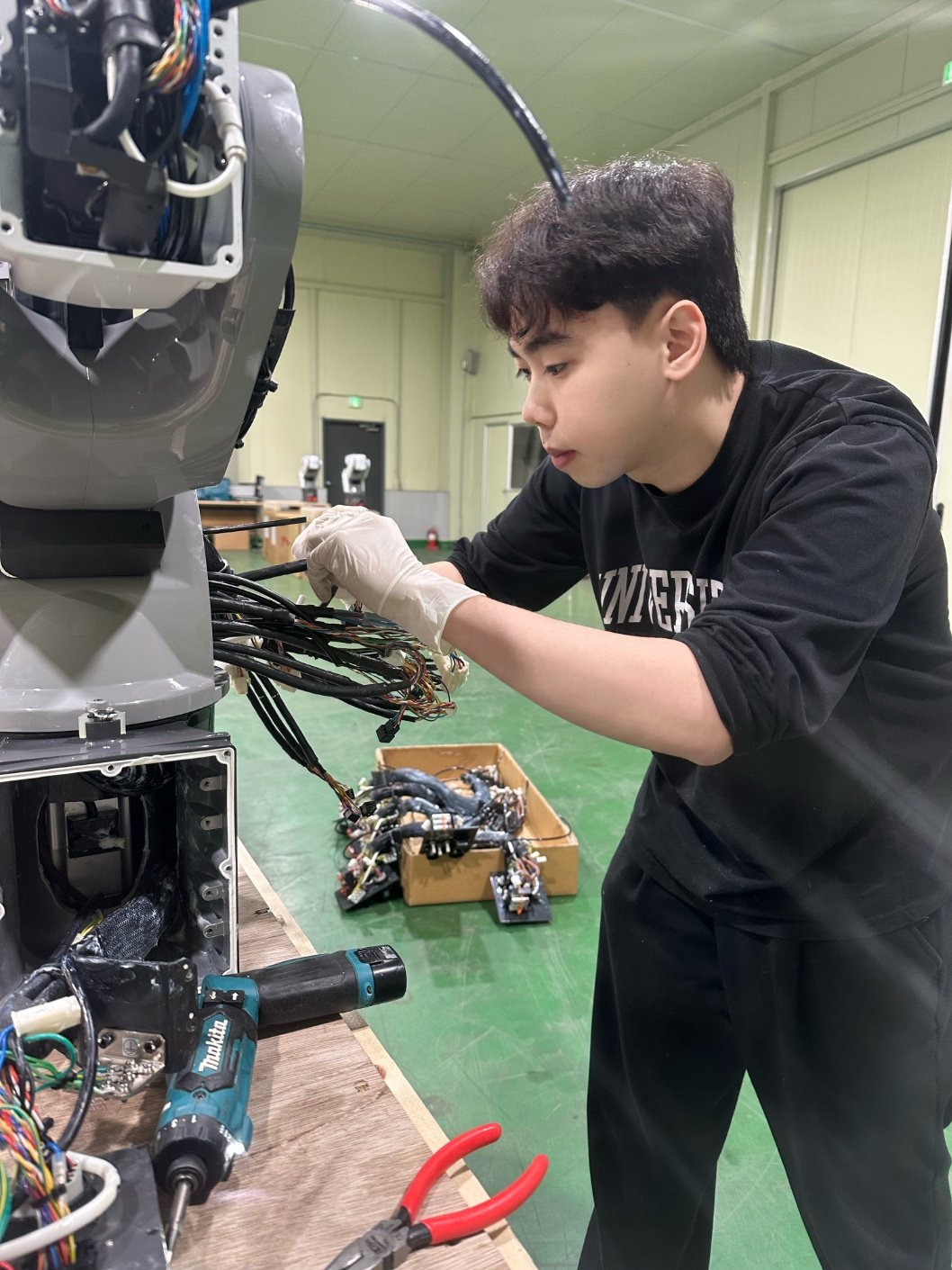 이달 7일 한국폴리텍다솜고 컴퓨터기계과를 졸업하고 산업용 로봇 제작 기업에 입사한 베트남 출신 동응옥두안 씨가 로봇 내부 연결선을 살피고 있다. 충북 제천에 있는 한국폴리텍다솜고는 다문화 청소년을 위한 기술계 기숙형 대안학교다. 2012년 개교했으며 매년 45명 안팎의 현장형 기능인재를 양성하고 있다.한국폴리텍대 제공