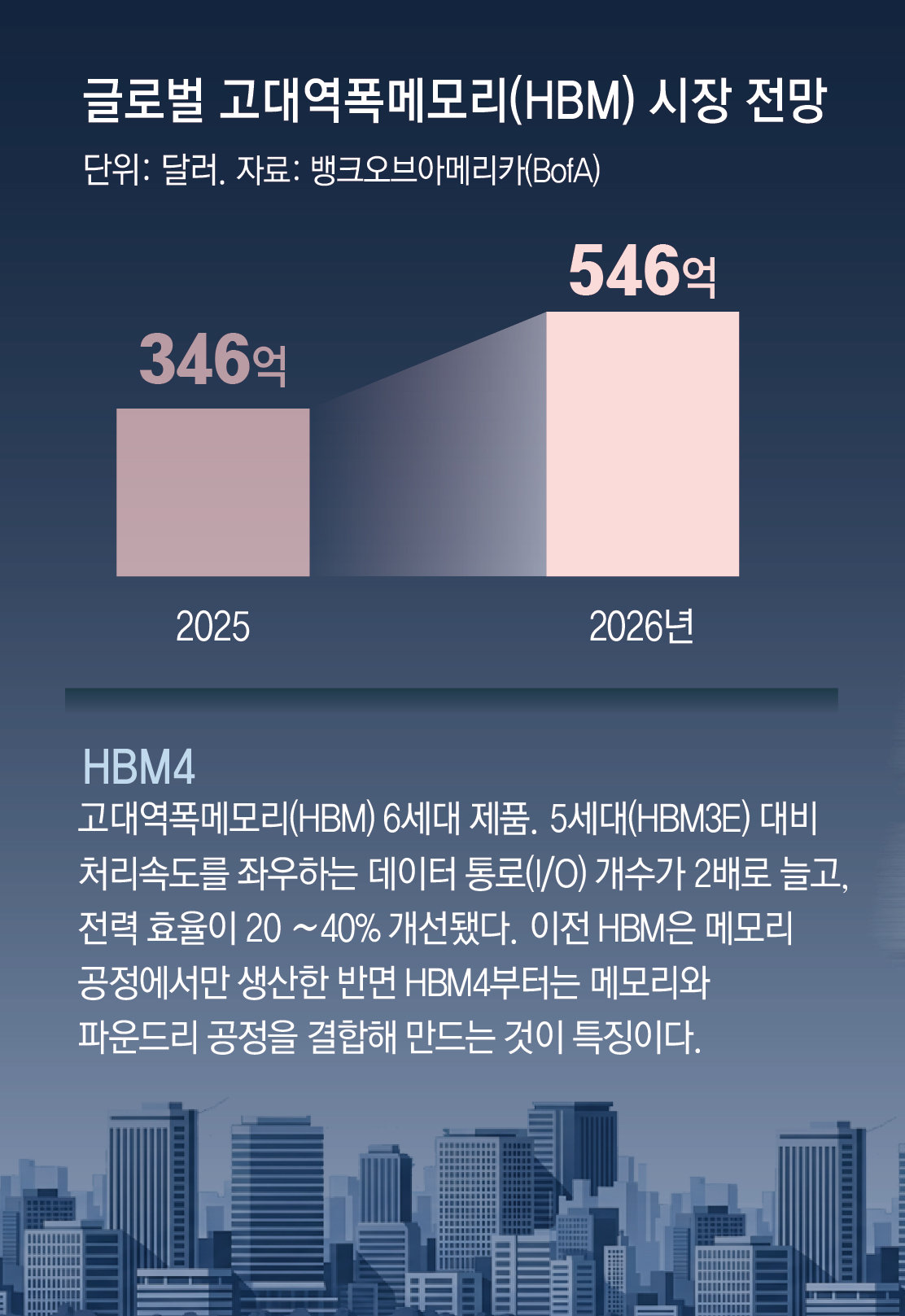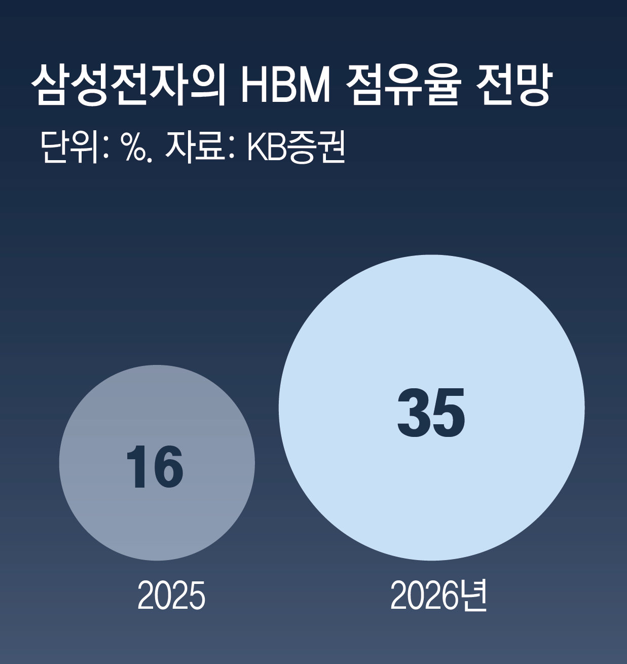삼성전자는 이같 은 우려를 뒤엎고 HBM4 성능 및 수율(정상품 비율)을 정상 궤도로 끌어올려 고객사들로부터 인정받는 데 성공했다. 김동원 KB증권 리서치본부장은 “삼성전자의 HBM4는 업계 최고 수준의 성능을 구현할 것으로 전망된다”고 말했다. 증권사들은 삼성전자의 올해 HBM 시장 점유율이 기존의 약 2배인 30%대로 뛸 것으로 보고 있다.