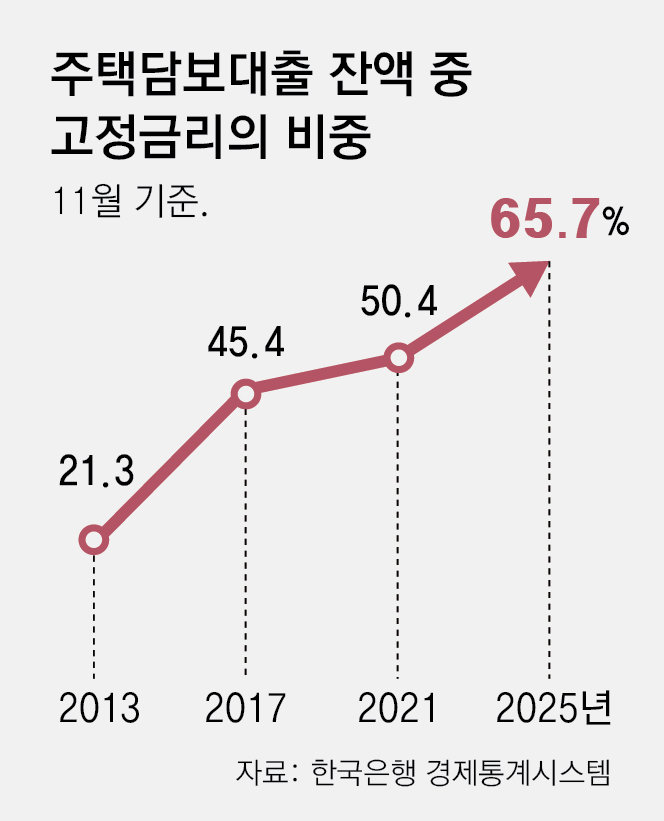 한은에 따르면 지난해 11월 주택담보대출 잔액 중 고정금리 비중은 65.7%로, 통계가 집계되기 시작한 2013년 1월(19.4%)에 비해 46.3%포인트 증가했다. 이는 5년 고정 후 변동금리로 전환되는 혼합형 금리도 포함된 숫자다.