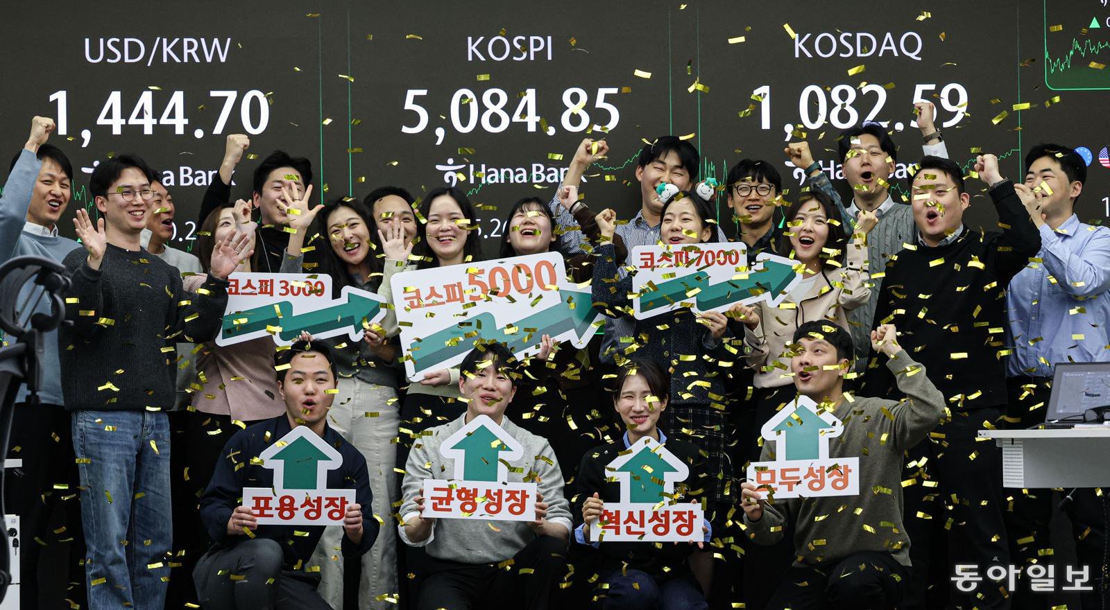 27일 오후 서울 중구 하나은행 본점 딜링룸에서 직원들이 종가 기준 코스피 5,000 돌파를 기념해 축하 행사를 하고 있다. 이날 코스피는 전 거래일 대비 2.73% 오른 5,084.85로 장을 마치며 사상 최고가를 경신했다. 종가 기준 5,000을 넘은 것은 처음이다.