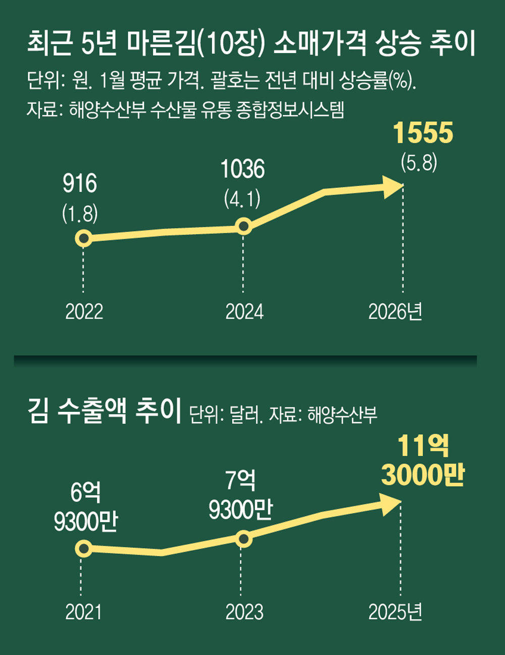 국내 백화점에서도 외국인 김 매출은 매년 확대되고 있다. 롯데백화점 본점의 외국인 김 매출은 지난해 전년 대비 30% 늘었고, 외국인 고객 매출 비중은 2021년 3% 수준에서 지난해 30%까지 확대됐다. 취급하는 김 상품 수도 2020년 94종에서 지난해 122종으로 늘었다. 김의 위상이 높아지면서 국내 소매 가격도 급등하고 있다. 해양수산부 수산물 유통종합정보시스템(aT KAMIS)에 따르면 마른김(10장) 소매 가격은 2022년 1월 평균 916원 수준이었지만 이달 26일 기준 1555원으로 약 70% 상승했다. 이은희 인하대 소비자학과 교수는 “김이 대표 수출 품목으로 떠오른 데다 가격까지 오르면서 대중적인 김 시장과 별개로 프리미엄 김 시장이 따로 생겨날 것”이라고 분석했다.