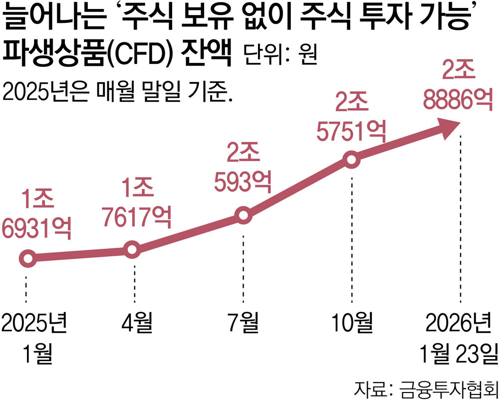 신용거래융자 잔액은 투자자가 증권사로부터 주식 매수를 위해 빌린 자금 중 아직 상환하지 않은 금액으로, 개인 투자자의 빚투 규모를 가늠할 수 있는 지표가 된다. 차액결제거래(CFD) 잔액도 증가하고 있다. CFD는 투자자가 실제 주식을 매수하지 않고도 증거금 40%만 있으면 증거금의 최대 2.5배까지 투자할 수 있는 일종의 빚투다. 2025년 1월 1조6931억 원에서 이달 23일 2조8886억 원으로 70% 넘게 증가했다.