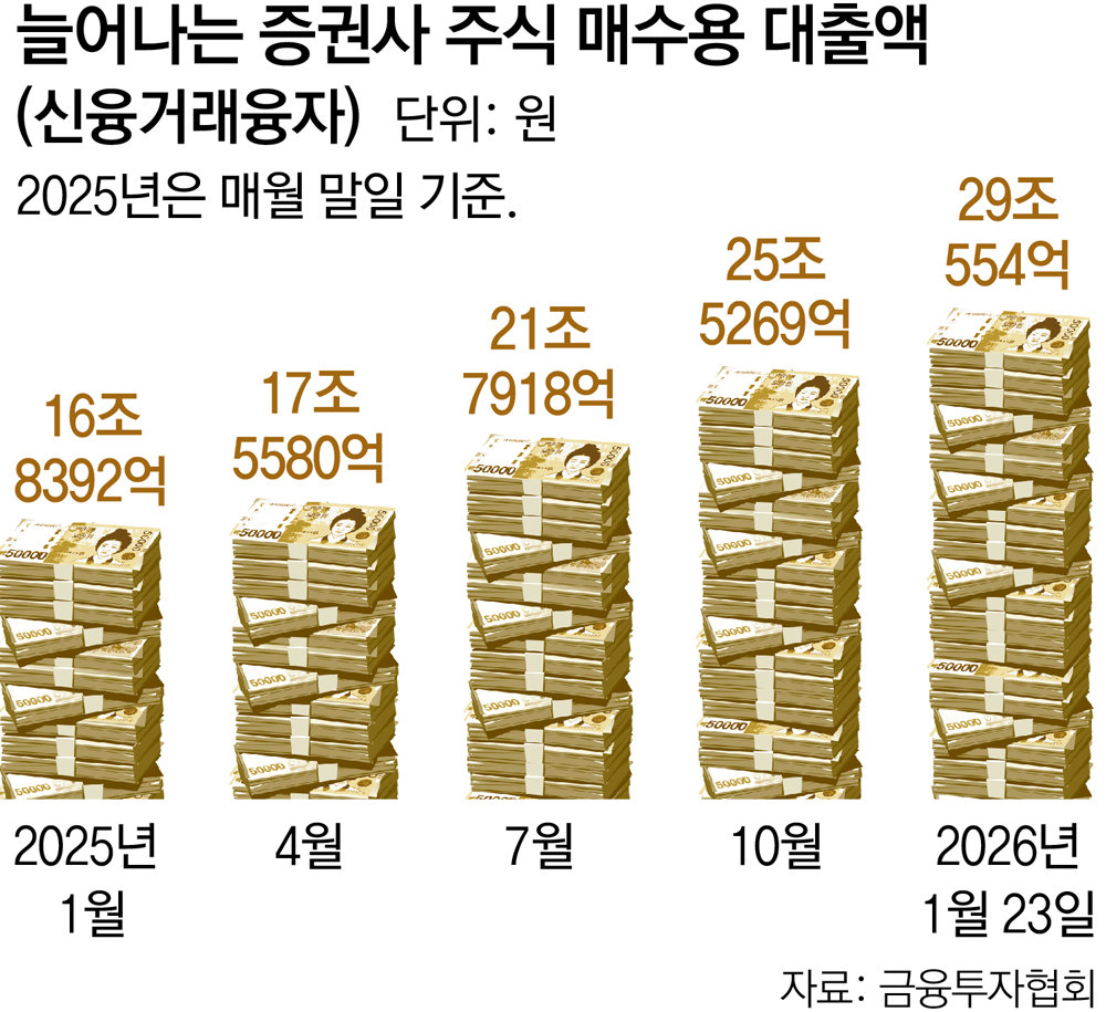 27일 금융투자협회에 따르면 이른바 빚투 지표로 불리는 신용거래융자 잔액이 처음으로 29조 원을 넘겼다. 신용거래융자 잔액은 1년 전인 지난해 1월 16조8392억 원이었는데, 같은 해 12월 27조2865억 원까지 불어났다. 국내 증시 ‘불장’이 지속되자 이달 20일에는 처음으로 29조 원을 넘겼다. 21일에는 29조821억 원으로 최고치를 찍기도 했다.