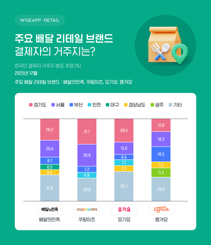 각 배달 앱의 결제자 거주지 분포를 보면 배민·쿠팡이츠·요기요는 공통으로 수도권 거주자 비율이 가장 높았다. 쿠팡이츠는 서울(31.1%)과 경기(26.8%) 등 수도권 결제자 비율이 57.9%로 절반을 넘었다. 배민의 서울·경기 비율은 46.6%였고, 요기요와 땡겨요는 각각 43.5%, 33.9%로 나타났다.