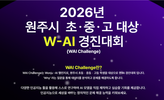 원주시가 주최하고 강원특별자치도원주교육지원청, 연세대학교 미래캠퍼스, 알고리즘 랩스(Algorithm LABS)가 주관하는 ‘제2회 와이 챌린지(W-AI Challenge)’가 개최된다.