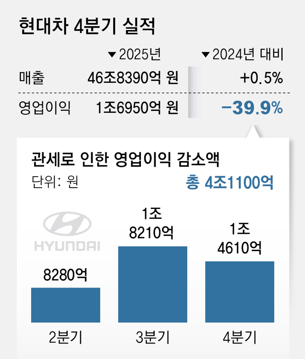 영업이익 급감의 주된 원인은 트럼프 행정부가 외국 자동차에 부과한 품목관세 부담이었다. 지난해 4월 3일부터 10월 말까지 7개월간 한국산 자동차에는 25% 관세가 적용됐다. 지난해 11월부터 관세 15%가 적용됐지만 이미 25% 관세율로 미국에 들여온 재고가 쌓여 있었던 까닭에 4분기에도 관세 영향권을 벗어나지 못했다.