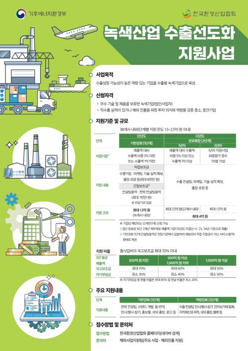 (사)한국환경산업협회(회장 김형근)는 기후에너지환경부의 ‘녹색산업 수출선도화 지원사업’ 전담기관으로 선정돼, 수출 성장 가능성이 높은 녹색산업 기업을 대상으로 수행기업 모집에 나섰다고 밝혔다.