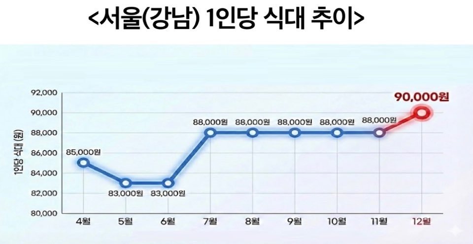 특히 강남 지역의 1인당 평균 식대는 지난해 10월 8만8000원에서 12월 9만 원으로 2.3% 오르며 9만 원대에 처음 진입했다. 이는 상위 10% 고가 예식장의 식대가 18.3% 상승하며 가격 지표인 중간 가격까지 동반 상승키킨 것으로 보인다고 소비자원은 밝혔다.