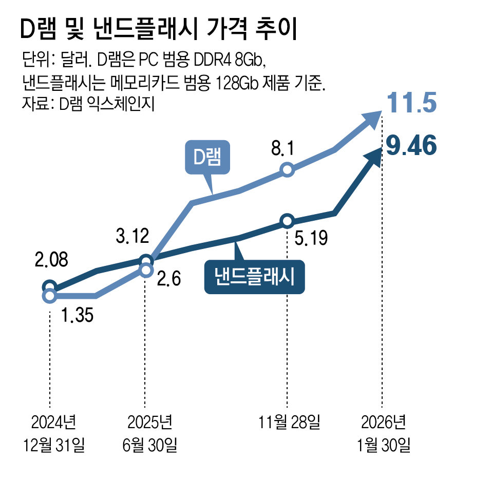 1일 글로벌 시장조사업체 D램익스체인지에 따르면 지난달 말 기준 낸드 범용 제품인 128Gb의 평균 거래가격은 9.46달러로 집계됐다. 지난해 말 5.74달러에서 3.72달러 오른 것으로, 상승률은 65%에 달한다. 같은 기간 D램 가격도 9.3달러에서 11.5달러로 올라 24% 상승했다. AI발 메모리 가격 상승이 해를 넘기며 이어지는 상황이다.