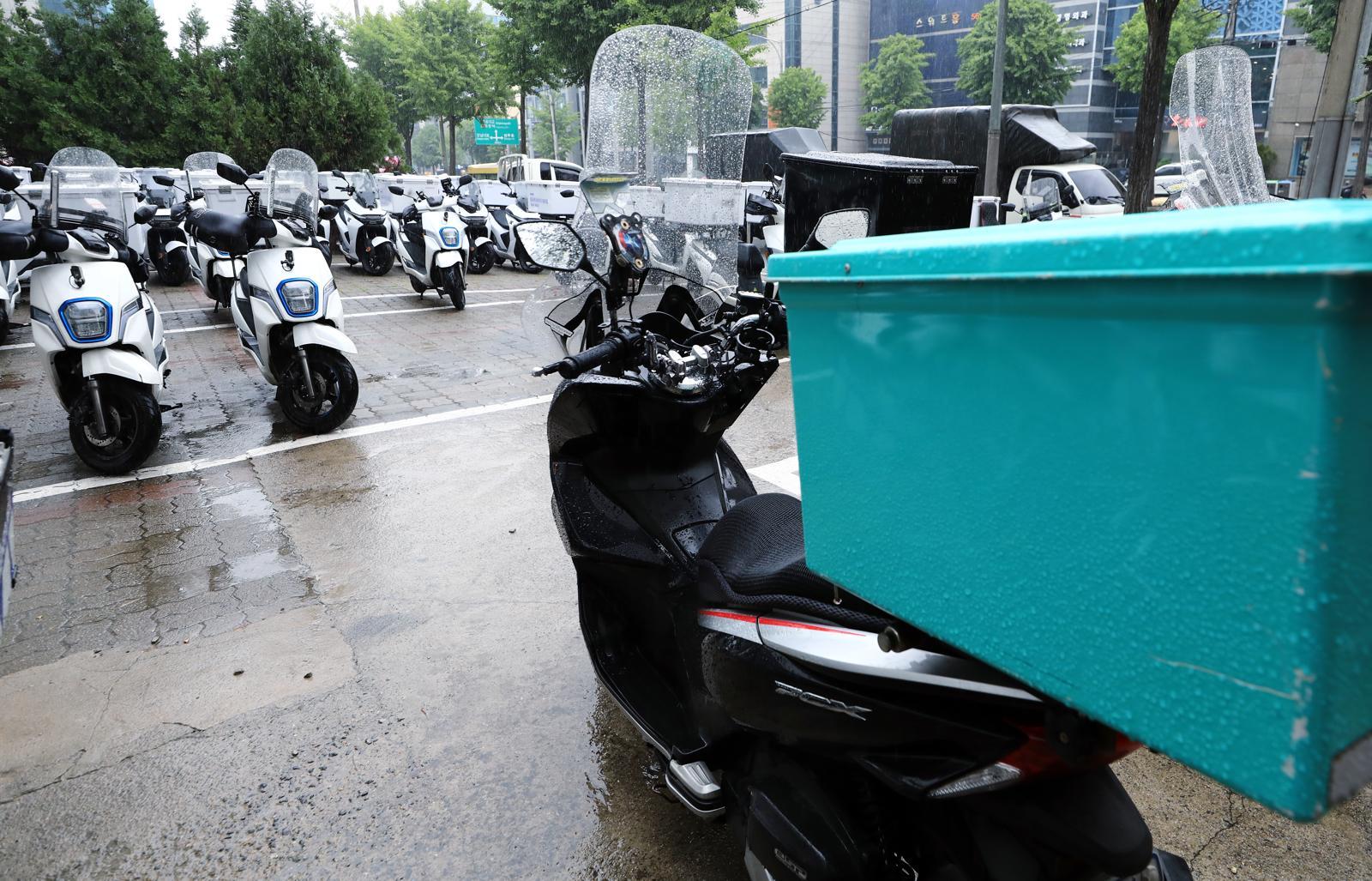 서울 강남구 역삼동 배달대행 업체 앞에 배달용 바이크가 주차되어 있다. 뉴스1