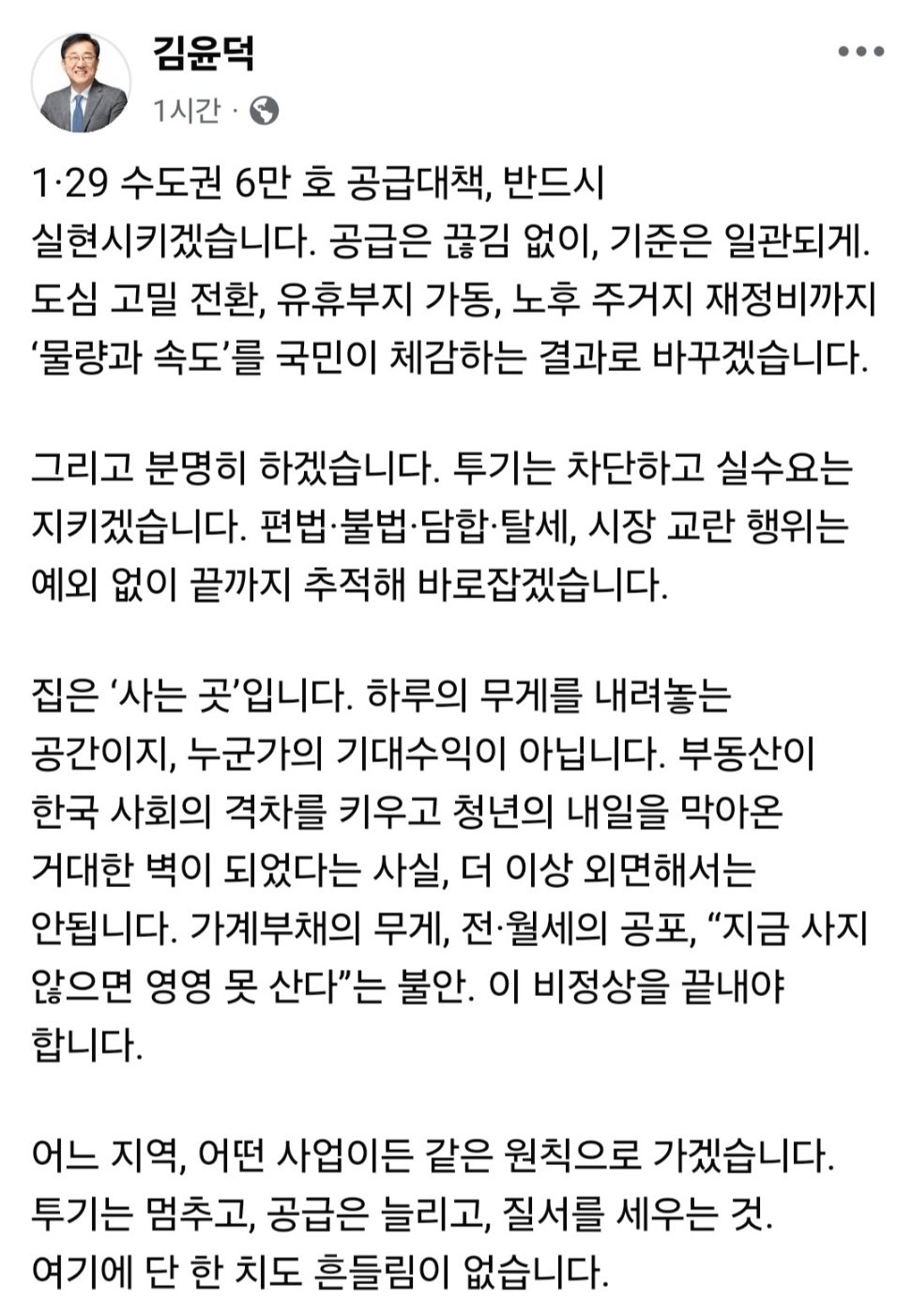 그는 또 “분명히 하겠다. 투기는 차단하고 실수요는 지키겠다”며 “편법·불법·담합·탈세, 시장 교란 행위는 예외 없이 끝까지 추적해 바로 잡겠다”고 약속했다.