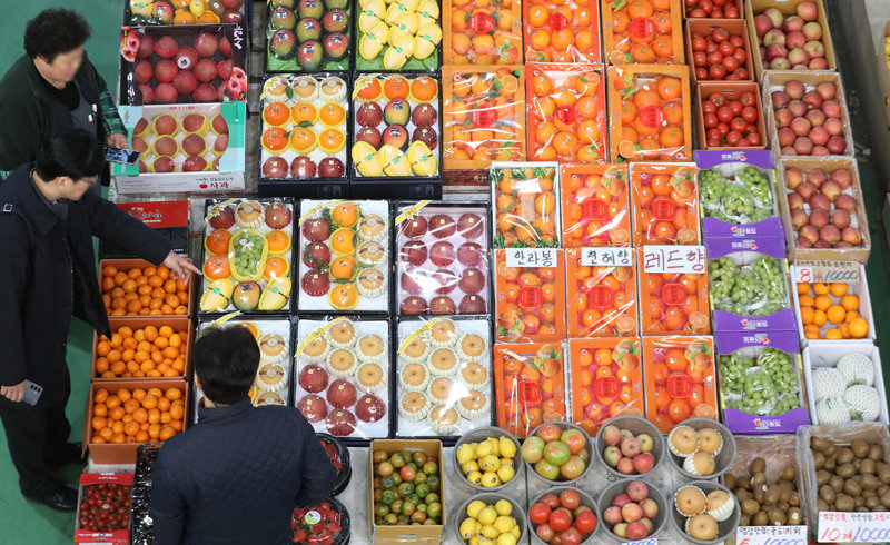 3일 부산 해운대구 반여농산물도매시장에서 설 명절을 앞두고 시민들이 과일을 살펴보고 있다.