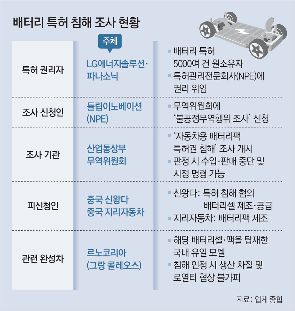 3일 정부와 재계에 따르면 산업통상부 무역위는 지난달부터 ‘자동차용 배터리팩 특허권 침해’ 조사에 착수했다. 신청인은 LG에너지솔루션과 파나소닉 배터리 특허 5000여 건을 관리하는 특허관리전문회사(NPE) 튤립이노베이션이다. 피신청인은 ‘외국 기업 A와 B’로만 알려졌으나, 취재 결과 중국 배터리 제조사 ‘신왕다(Sunwoda)’와 완성차 업체 ‘지리자동차’로 확인됐다.