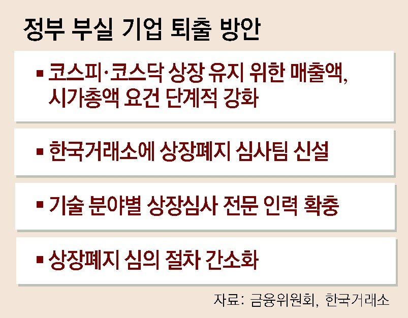 금융당국이 부실기업 퇴출에 속도를 내기 위해 거래소 내 상장폐지 심사팀을 새롭게 꾸린다. 오랜 기간 이어진 ‘코리아 디스카운트(한국 증시 저평가)’에서 벗어나고 코스닥 시장의 신뢰를 높이기 위해서다.
