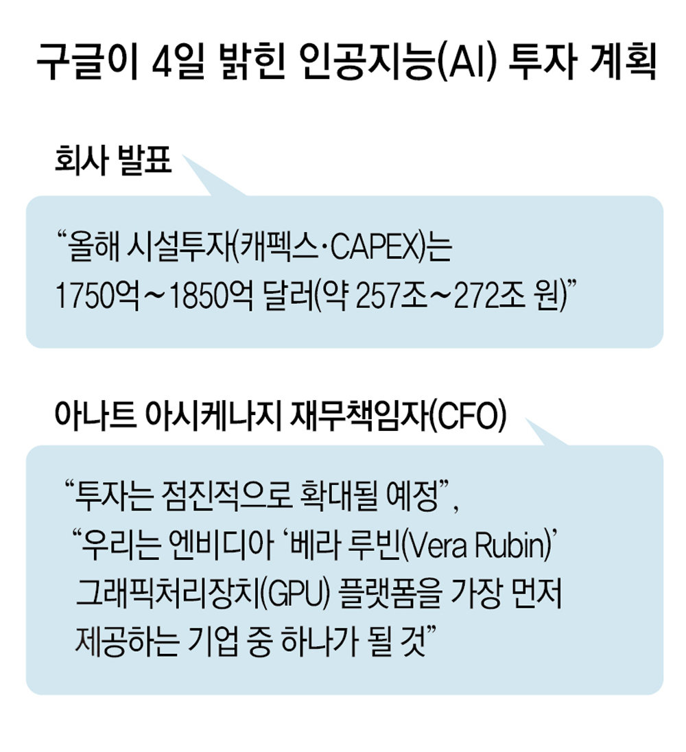 하지만 정작 시장 반응은 냉담했다. 실적 발표 전인 4일(현지 시간) 1.96% 하락한 알파벳 주가는 실적 발표 후 장외거래에서 추가로 2%가량 하락했다. 알파벳이 올해 AI 관련 투자를 2배로 늘리겠다고 밝힌 여파다. 순다르 피차이 알파벳 최고경영자(CEO)는 “올해 설비투자는 1750억∼1850억 달러(약 257조∼272조 원)가 될 것”이라고 밝혔다. 설비투자가 늘면 구글의 수익성이 악화하고, 주주환원이 줄어들 수 있다는 우려가 커진 것이다.
