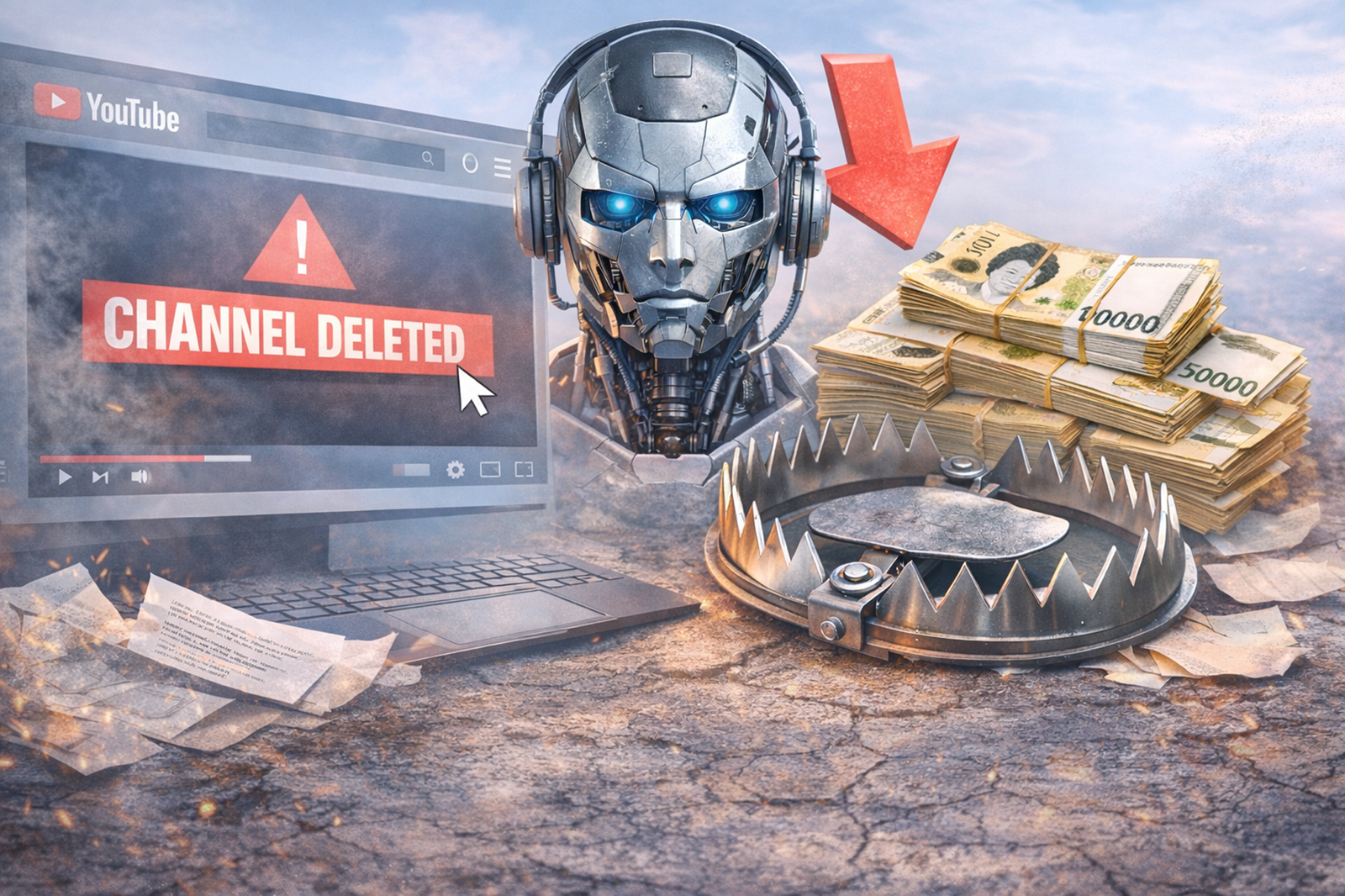유튜브 화면에 ‘CHANNEL DELETED’ 경고가 표시된 이미지와 인공지능을 상징하는 그래픽. 플랫폼이 저품질 AI 콘텐츠에 대한 단속과 수익 구조 재편에 나서고 있음을 시각적으로 표현했다. 일러스트=챗GPT AI 생성