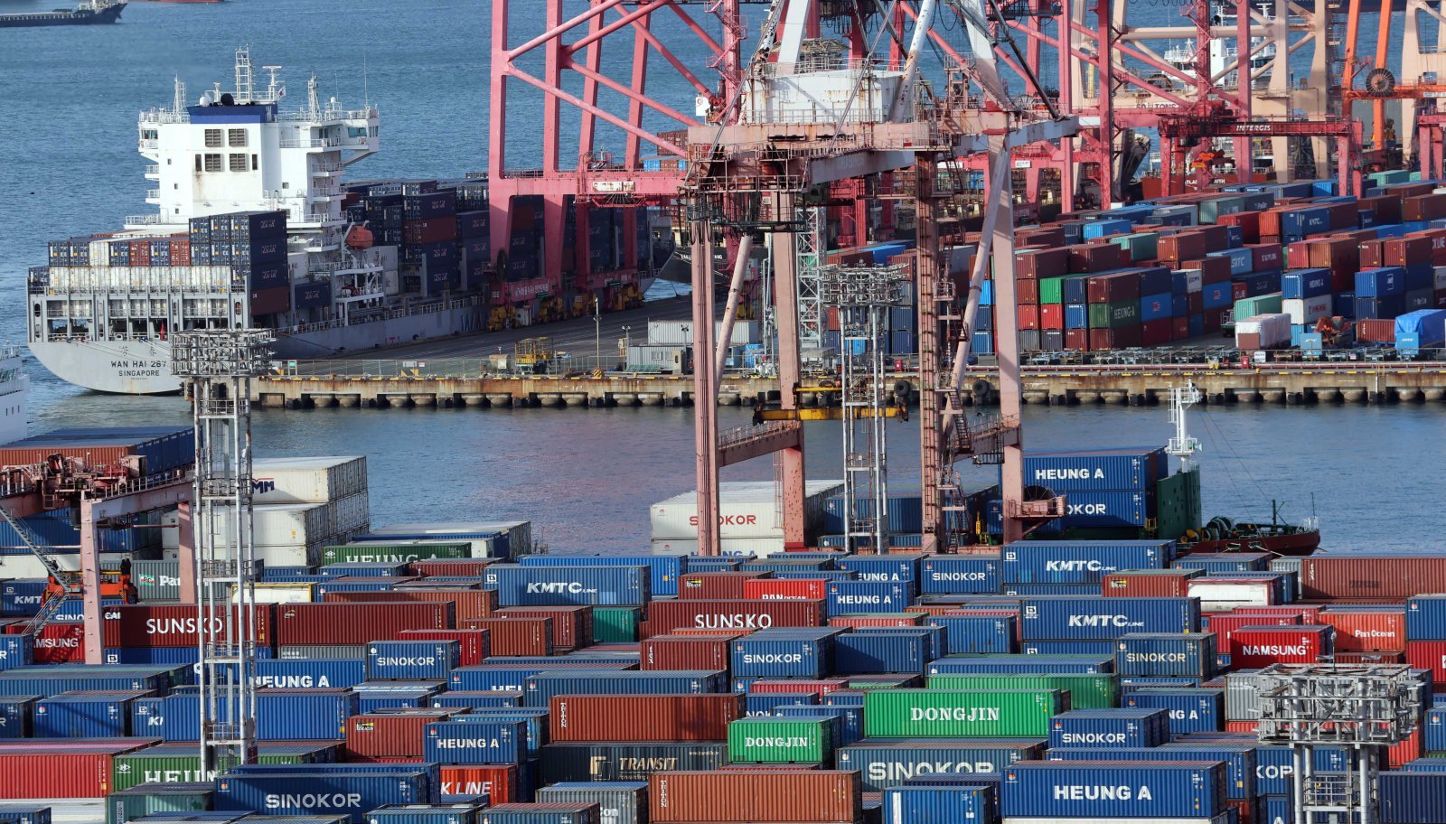 1일 산업통상부가 발표한 ‘2025년 연간 및 12월 수출입 동향’에 따르면 지난해 수출은 1년 전보다 3.8% 증가한 7097억 달러(1025조2600억원)를 달성, 역대 최대 실적을 기록했다. 이날 부산 남구 신선대(사진 아래) 및 감만(위) 부두 야적장에 수출입 컨테이너가 쌓여 있다. 2026.01.01 부산=뉴시스