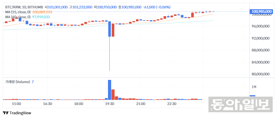 잘못 지급된 비트코인 물량 중 일부가 빗썸 시장에 매물로 쏟아지면서 비트코인 가격은 한때 8111만 원까지 하락했다. 7일 0시 20분 현재 시세인 1억100만 원보다 20% 가까이 낮은 가격이다. 빗썸은 “내부 통제 시스템을 통해 이상 거래를 즉시 인지했으며 관련 계정에 대한 거래를 신속히 제한해 시장 가격이 5분 내 정상 수준으로 회복됐다”고 해명했다.