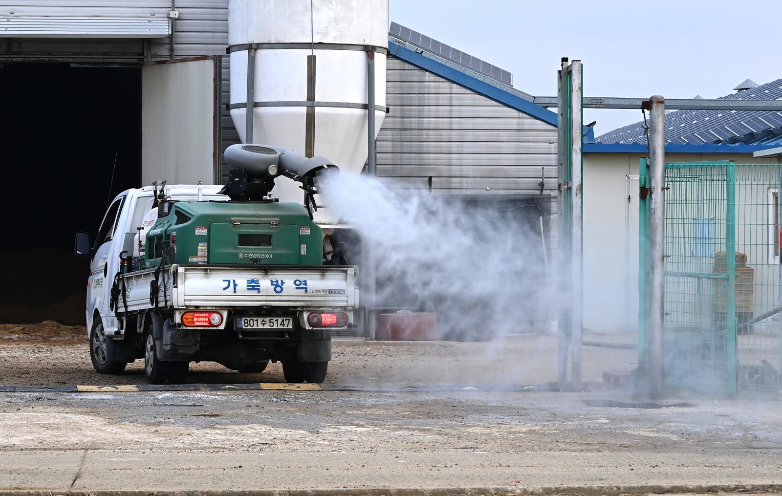 경기농협 공동방제단 방역차량이 5일 경기 평택시 서탄면 한 농장에서 가축 질병 확산방지를 위한 방역작업을 하고 있다. 경기농협은 최근 고병원성조류인플루엔자(AI), 구제역, 아프리카돼지열병(ASF) 등 주요 가축전염병이 전국적으로 확산되자 공동방제단을 동원해 축산농가, 밀집 사육단지, 철새도래지 등에 대한 방역 활동을 강화하고 있다. 2026.02.05. 평택=뉴시스