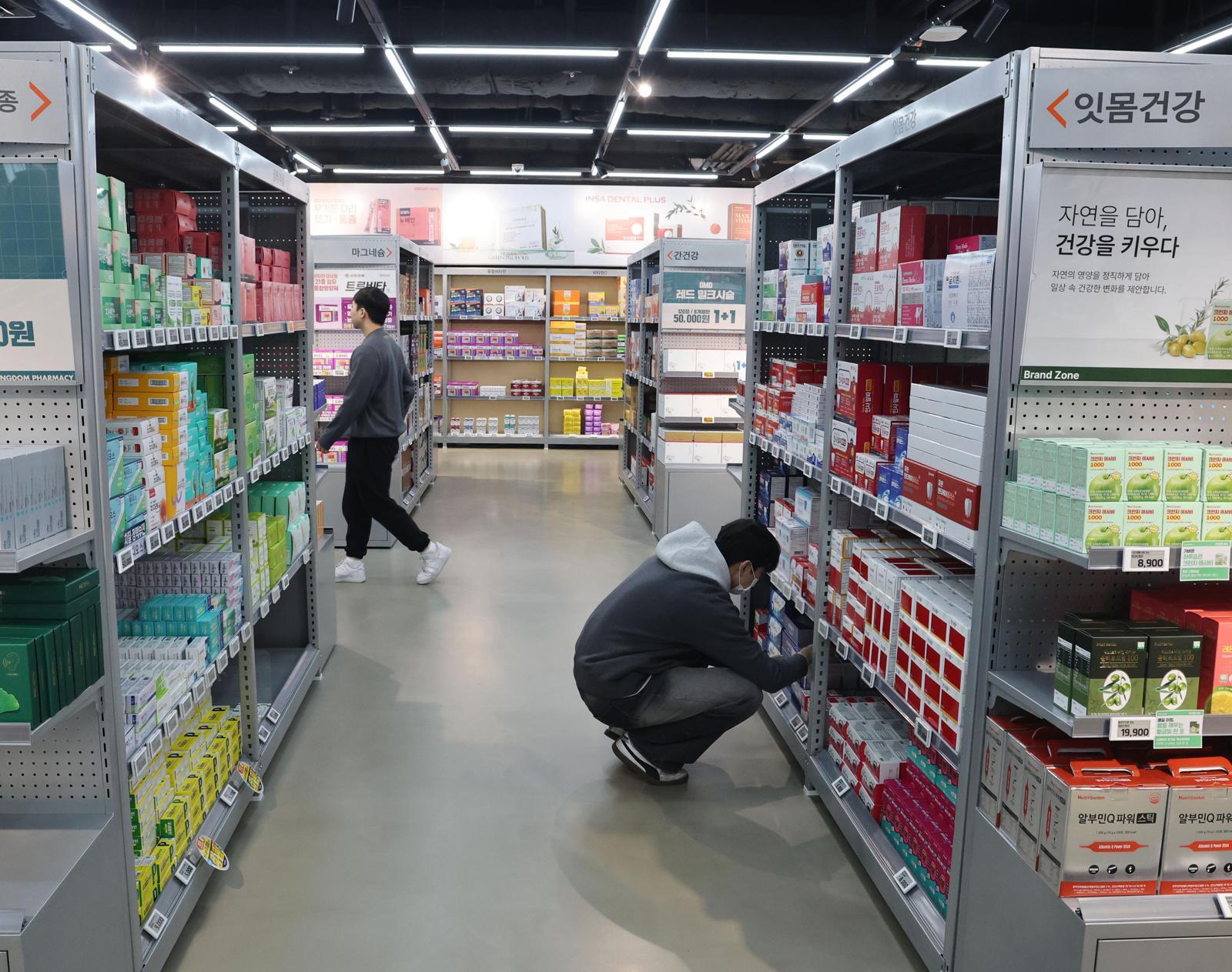 8일 서울 용산구 용산전자랜드의 창고형 약국 ‘메디킹덤약국’을 찾은 방문객들이 상품을 살펴보고 있다. 7일 문을 연 메디킹덤약국은 의약품을 비롯해 건강기능식품, 반려동물 관련 제품 외에 ‘K뷰티 화장품 전문존’도 별도로 운영한다.