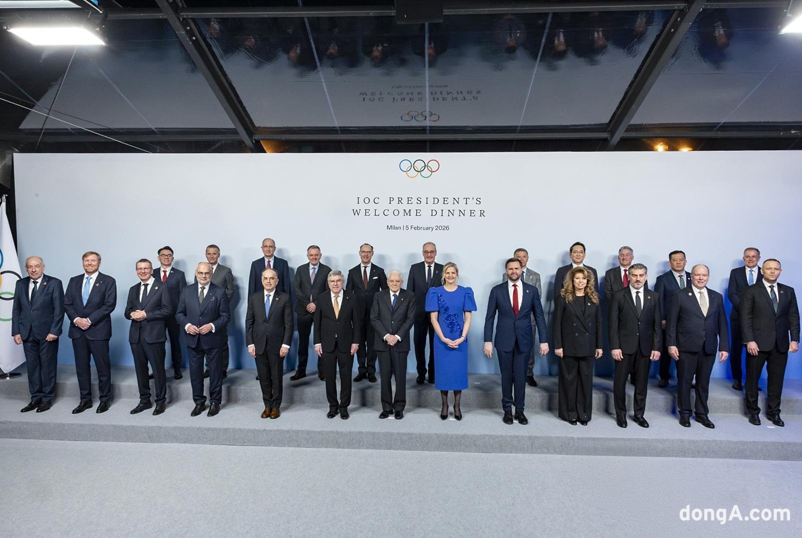 이탈리아 밀라노-코르티나 담페초 동계올림픽 개막을 하루 앞두고 5일(현지시간) 열린 갈라 디너 행사에서 이재용 삼성전자 회장(뒷줄 오른쪽 4번째)이 커스티 코번트리 국제올림픽위원회(IOC) 위원장(앞줄 오른쪽 6번째) 및 세르조 마타렐라 이탈리아 대통령(앞줄 오른쪽 7번째), JD 밴스 미국 부통령(앞줄 오른쪽 5번째) 등 함께 참석한 세계 각국의 정상급 지도자, 기업인들과 기념촬영하고 있다.