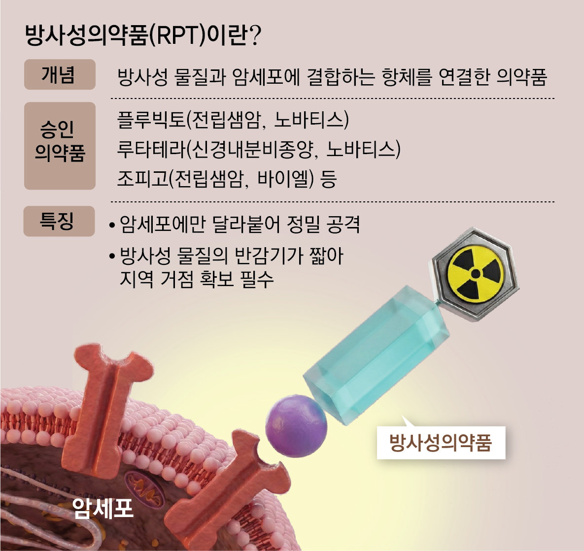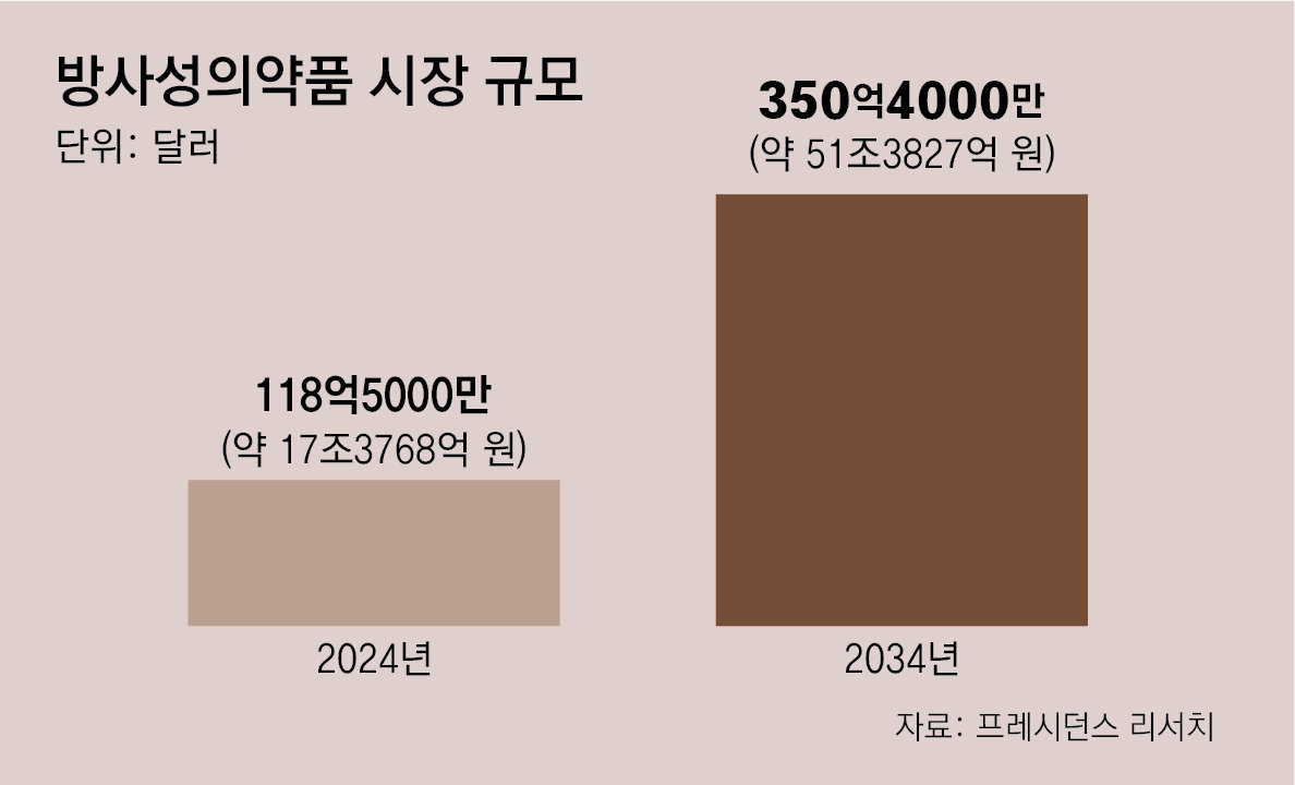 방사성의약품은 암세포 표면에 달라붙는 항체와 방사성물질을 결합한 물질이다. 방사선을 쪼이는 항암 치료의 경우 암세포 주변의 정상 세포까지 망가뜨리며 여러 부작용을 불러온다. 방사성의약품은 이런 부작용을 최소화하면서, 암세포와 근접한 거리에서 방사선을 쪼일 수 있기 때문에 효과가 뛰어나다는 장점이 있다. 시장조사기관 프레시던스 리서치는 글로벌 방사성의약품 시장이 2024년 118억5000만 달러(약 17조3768억 원)에서 2034년에는 350억4000만 달러(약 51조3827억 원) 규모를 돌파할 것으로 전망했다.