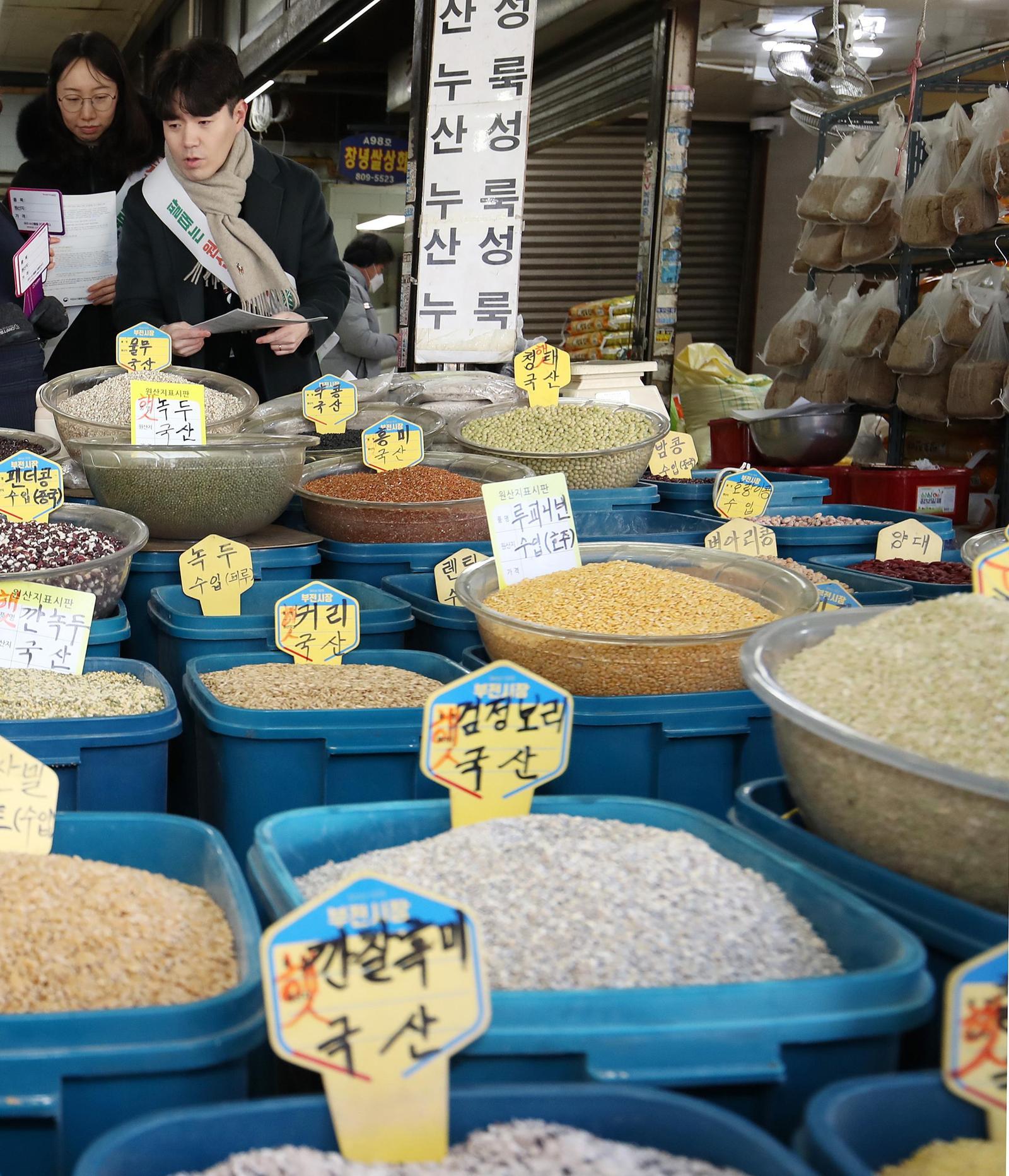 설 연휴를 앞둔 9일 부산 부산진구 부전시장에서 구청 공무원들이 농축수산물 원산지 표시 특별 점검을 하고 있다.