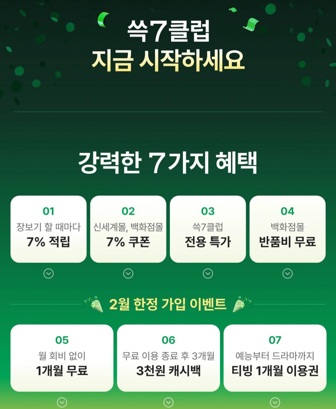 쓱세븐클럽 혜택엔 신세계백화점몰, 신세계몰 최대 7% 할인 쿠폰이 포함된다. 패션, 뷰티, 리빙 등 다양한 상품군에 적용 가능하다. 3월에는 온라인동영상서비스(OTT) 티빙(TVING) 옵션형도 출시된다. 부담 없는 추가 비용으로 차별화된 K콘텐츠와 프로야구, 프로농구 등 생생한 스포츠 중계, 인기 방송 주문형 비디오(VOD)까지 폭넓게 즐길 수 있게 된다.