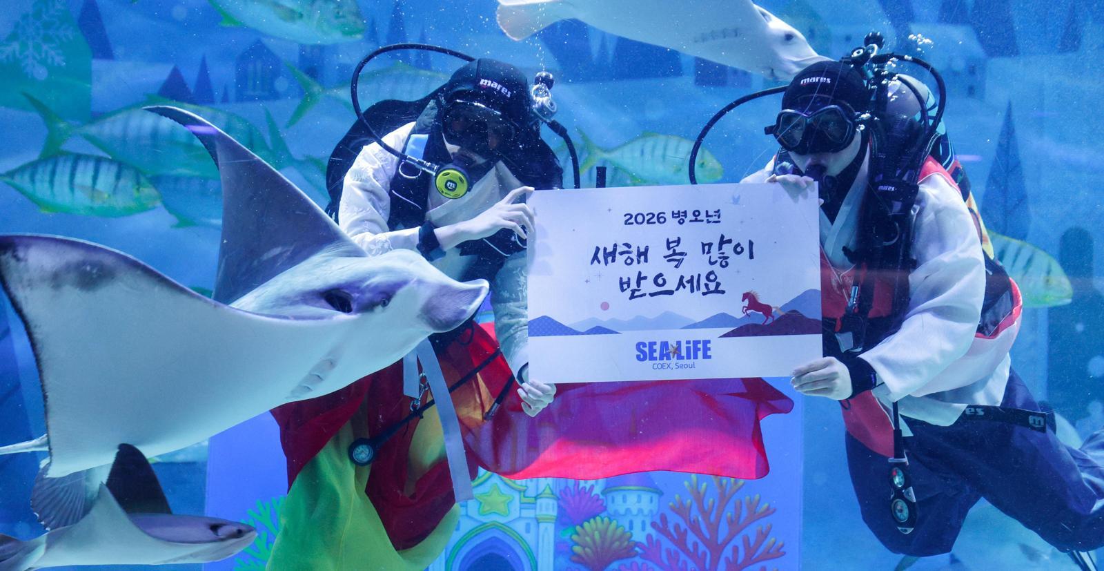 10일 서울 강남구 코엑스 아쿠아리움에서 한복을 입은 스쿠버다이버들이 설 명절 인사를 전하고 있다.