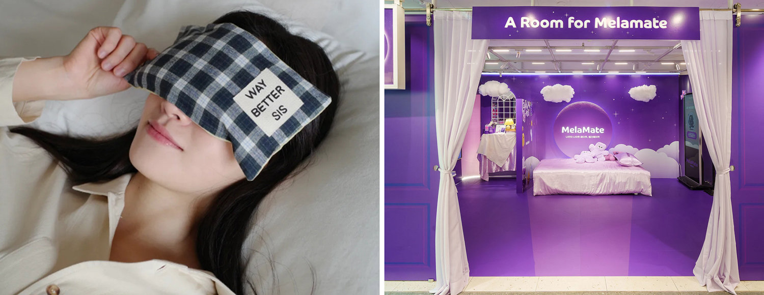 수면의 질을 최대한 끌어올리는 ‘슬립맥싱’이 새로운 트렌드로 떠오르면서 수면 산업 시장이 연간 4조 원대로 커지고 있다. 29CM에서 판매 중인 수면 안대(왼쪽 사진)와 이달 1일부터 서울 강남구 올리브영 강남타운점에서 진행 중인 CJ웰케어 멜라메이트 팝업 스토어. 각 사 제공