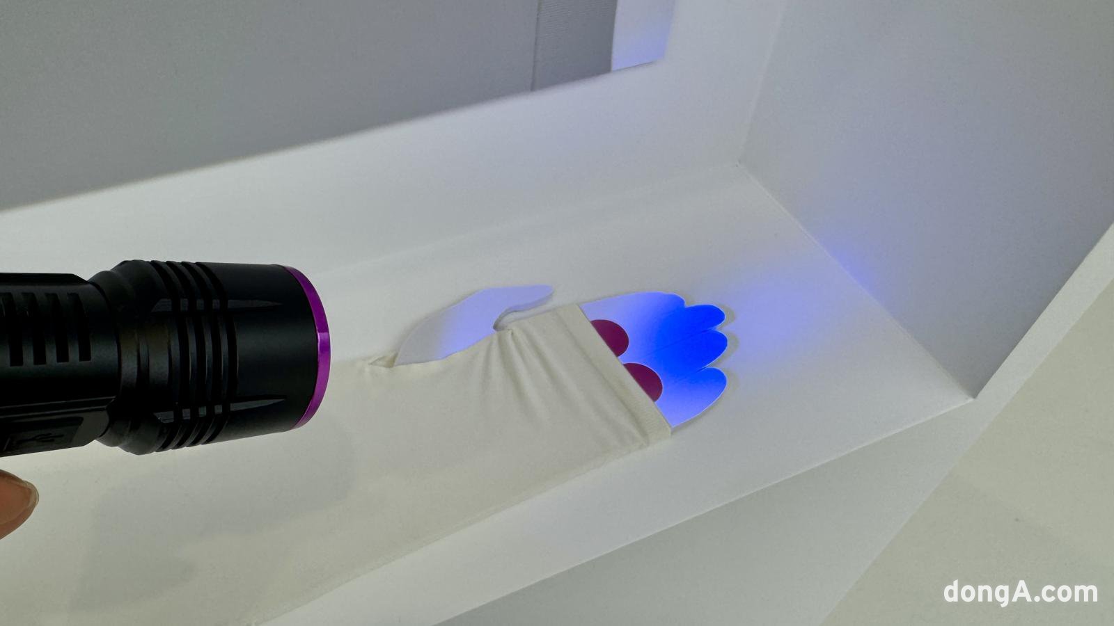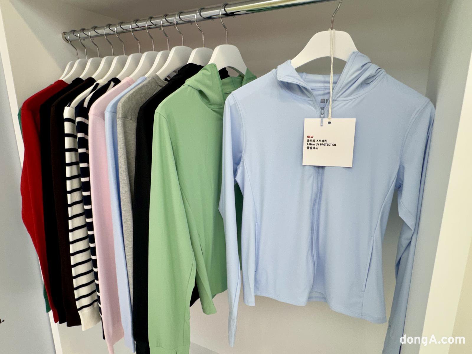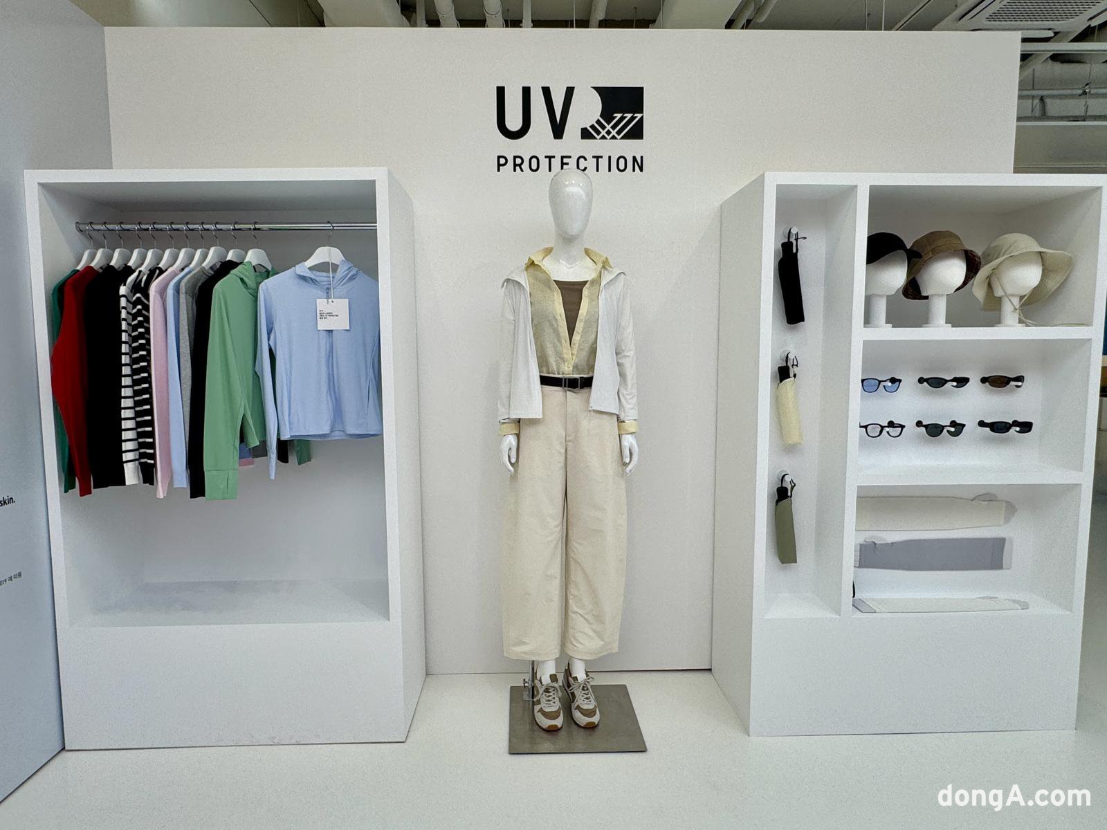 기능성 존에서는 UV 차단 라이프웨어 제품군을 집중 조명했다. 모자, 선글라스, 가디건, 재킷 등 자외선 차단 기능을 갖춘 다양한 아이템이 진열됐다. 특히 현장에서 진행된 자외선 조사 시연이 인상적이었다. 자외선을 쬐었을 때 노출된 부분의 스티커는 보라색으로 변했지만, 제품으로 가려진 부분은 하얀색 그대로였다. 유니클로 제품의 UV 차단 성능을 눈으로 직접 확인할 수 있었다.