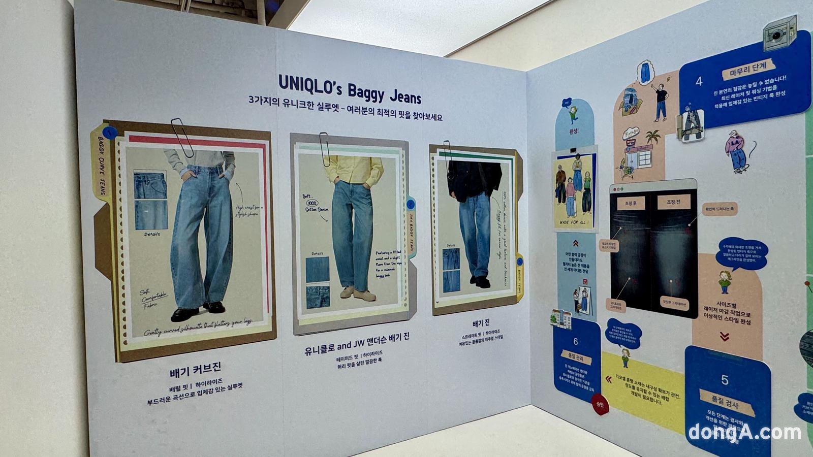 데님 존에서는 유니클로의 기술력을 집약한 제작 공정을 소개했다. 2016년 로스앤젤레스에 설립된 ‘진 이노베이션 센터’는 원단 개발부터 실루엣 조정까지 데님 제작 전 과정을 담당한다. 이곳은 지난해 전세계적으로 인기를 끈 ‘배기 커브 진’이 탄생한 곳이기도 하다. 실의 종류와 스티치 정밀도의 조합, 후면 포켓을 통한 내구성 강화 등 최적의 실루엣을 구현하기 위한 연구가 이뤄졌다고 한다.