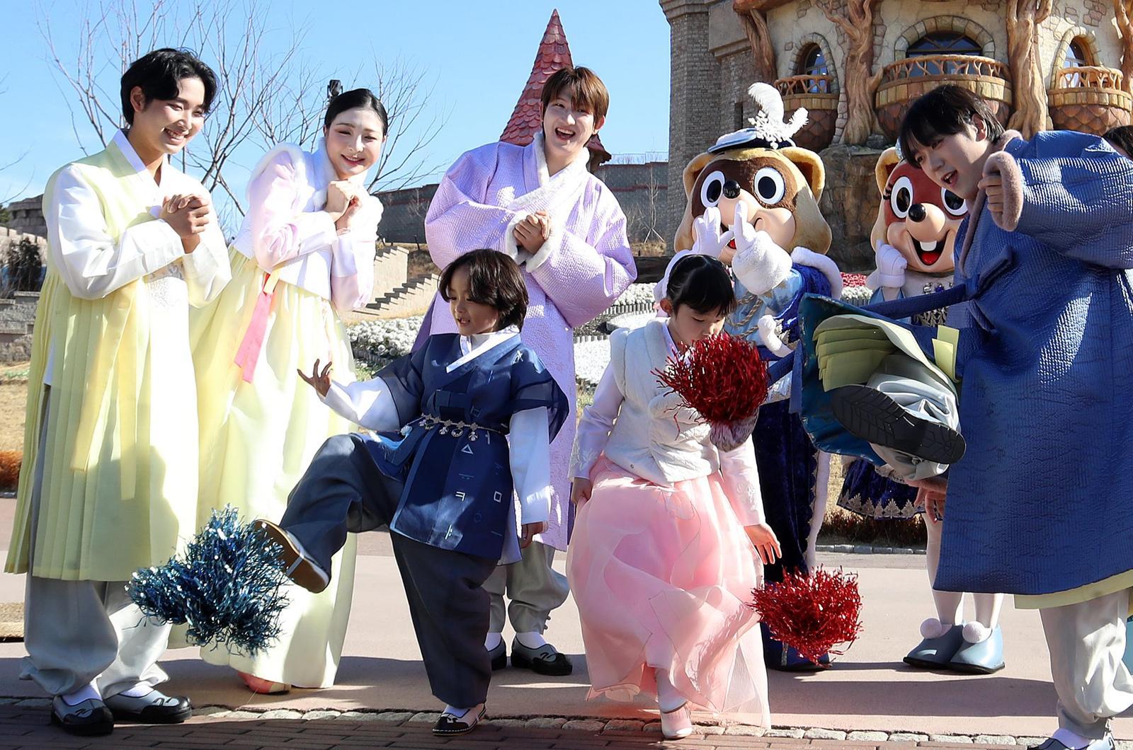 12일 부산 기장군 롯데월드 어드벤처 부산에서 한복을 입은 시민들이 제기차기를 즐기고 있다. 롯데월드 어드벤처 부산은 설 연휴 기간인 14일부터 18일까지 로열가든 광장에서 ‘설날 민속놀이 한마당’을 진행한다.