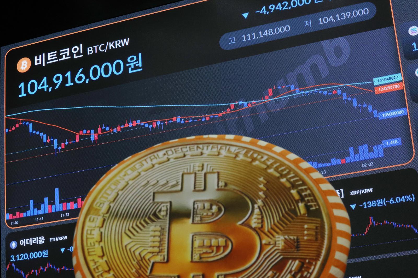 [서울=뉴시스] 비트코인 가격이 7만1000달러 아래로 떨어진 5일 서울 강남구 빗썸라운지에 전광판에 비트코인 등 암호화폐 시세가 나오고 있다. 2026.02.05.