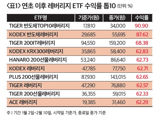 올해 코스피가 연초 대비 25% 넘게 급등하자 상장지수펀드(ETF) 수익률도 고공행진하고 있다. 한국거래소에 따르면 올해(1월 2일~2월 10일) 들어 벌써 100%에 육박하는 수익률을 거둔 상품도 있다. 1058개 ETF 가운데 90.90% 수익률로 1위에 오른 ‘TIGER 반도체TOP10레버리지’가 그것이다(표1 참조). 지난해부터 코스피 상승을 주도하는 국내 반도체 핵심 종목에 레버리지로 투자한 결과다. 2024년 7월 상장된 이 상품은 SK하이닉스와 삼성전자, TIGER 반도체TOP10, 한미반도체를 큰 비중으로 담고 있다. 상장 이후 수익률은 256.78%에 달한다.