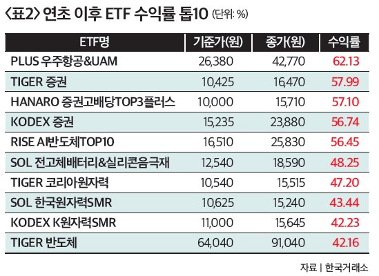 연초 이후 ‘불장’에 증권주 ETF 부각 레버리지를 제외하면 올해 상승폭이 큰 테마는 우주항공, 증권, 반도체, 이차전지, 원자력이다(표2 참조). 먼저 ‘PLUS 우주항공&UAM’은 수익률 62.13%로 12위에 올랐는데, 수익률이 레버리지 상품 못지않다. 세계 최대 우주기업 스페이스X가 올해 기업공개(IPO)를 추진하고 있는 가운데 우주항공산업 성장 기대감에 자금이 몰린 영향이다. 위성시스템 개발업체 쎄트렉아이를 중심으로 인텔리안테크, 한화시스템, 한국항공우주, 에이치브이엠 등을 담고 있다.