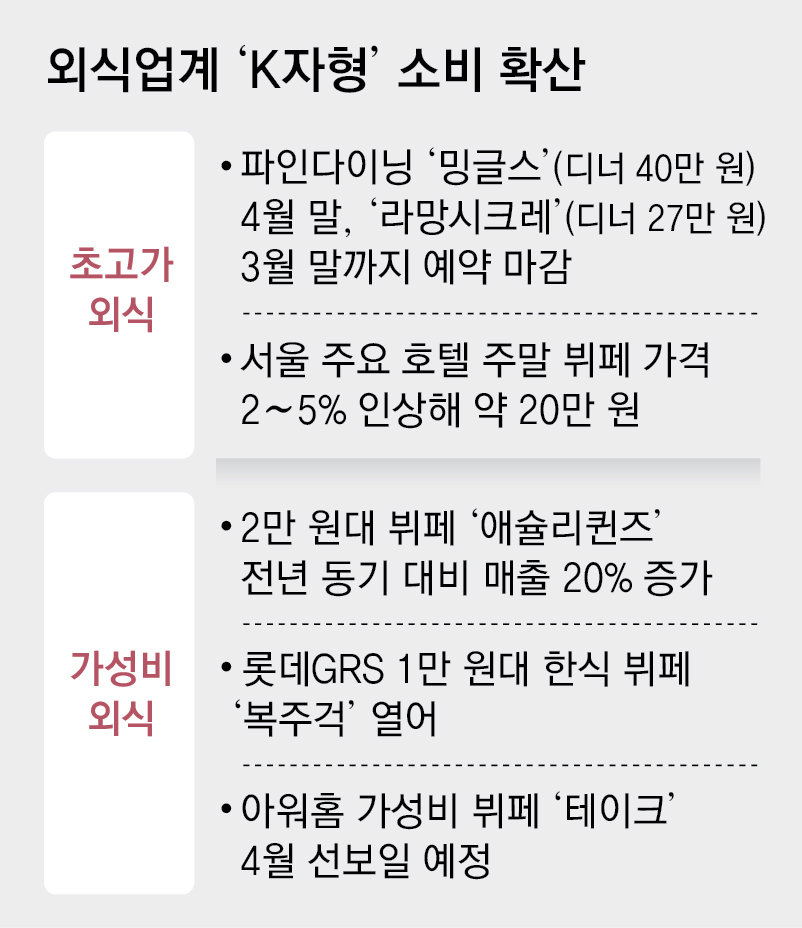 고물가 기조가 이어지면서 외식 시장에서 소비 양극화를 가리키는 ‘K자형 소비’ 흐름이 뚜렷해지고 있다. 한 끼에 20만 원이 넘는 특급호텔 뷔페와 파인다이닝은 가격 인상에도 예약이 금방 차고, 1만∼3만 원대 ‘가성비’를 내세운 뷔페 수요도 급증하고 있다.
