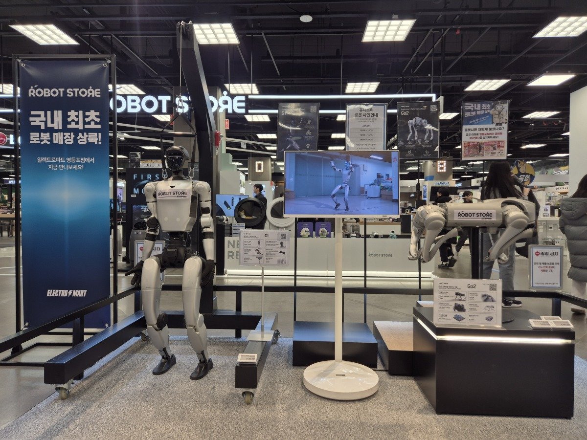 2월 10일 이마트 일렉트로마트 서울 영등포점 ‘로봇 스토어’에서 판매 중인 로봇 제품을 고객들이 체험해보고 있다. 임경진 기자매장에서 판매하는 휴머노이드 로봇은 1월 미국 라스베이거스에서 열린 세계 최대 정보기술(IT)·가전 전시회 ‘CES 2026’에서 ‘복싱 로봇’으로 주목받은 중국 유니트리의 휴머노이드 로봇 ‘G1’ 기본형이다. 판매가는 3100만 원으로 걷거나 손을 흔드는 등 단순한 작업이 가능하다. 빨래 개기, 청소 등 실질적인 가사노동을 학습하는 기능은 빠져 있다. 월·화요일을 제외하고 오후 1시, 4시, 7시에 15분 동안 G1이 춤추고 발차기하는 시연이 진행되는데, 이때 쓰이는 모델은 이마트에서 판매하는 기본형이 아니라 대리점을 통해 별도 주문해야 하는 7000만 원대 모델이다.