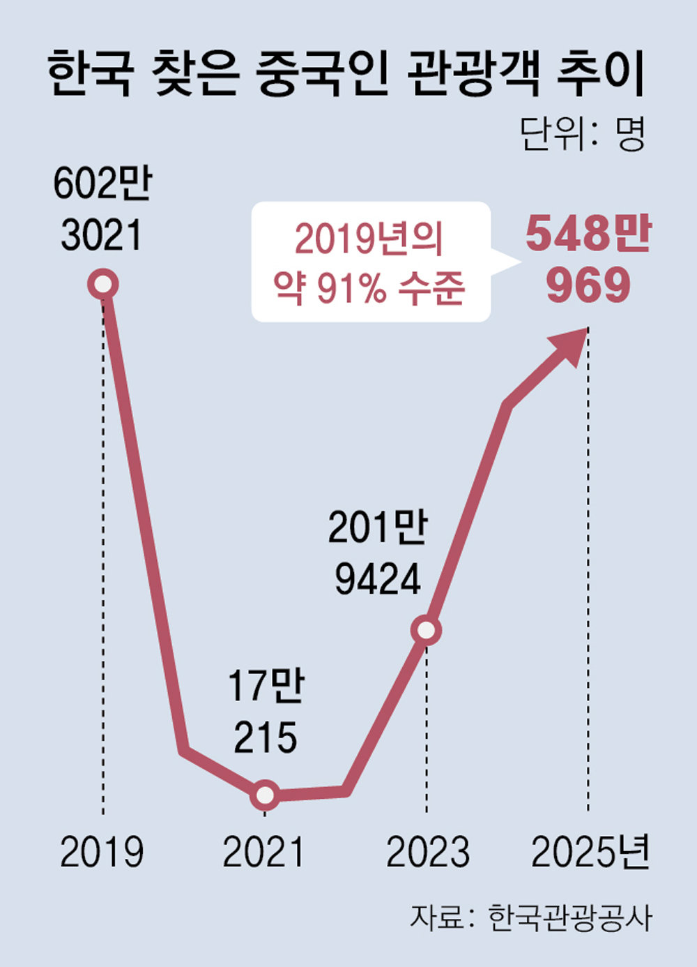 유통업계 안팎에서는 이번 춘제 특수가 일회성에 그치지 않고 연중 소비 확대로 이어질지 주목하고 있다. 중국인 관광객 유입은 지난해부터 회복세를 보이고 있다. 지난해 방한 중국인 수는 548만969명으로 전년(460만3273명) 대비 19.1% 증가했다. 팬데믹 이전인 2019년(602만3021명)과 비교하면 90% 이상 회복한 수준이다. 올해는 증가 폭이 더 커질 것이라는 관측도 나온다. 여행·관광산업 전문 연구기관인 야놀자리서치는 올해 한국을 찾는 중국인이 615만 명에 이르고, 중일 갈등에 따른 반사이익이 본격화되면 최대 700만 명까지 확대될 것으로 봤다.