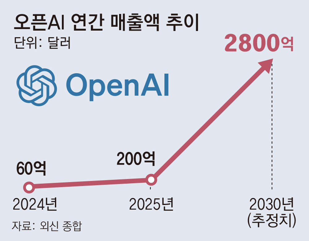 세라 프라이어 오픈AI 최고재무책임자(CFO)는 지난달 “2025년 기준 회사의 연간 매출이 200억 달러(약 28조 원)를 넘어섰다”고 밝힌 바 있다. 이는 전년 약 60억 달러(약 8조 원)에서 세 배 이상으로 증가한 수치다. 오픈AI는 2030년까지 총매출이 2800억 달러(약 405조 원)를 넘어설 것으로 예상하고 있다. 이는 지난해 말 오픈AI가 자체적으로 밝힌 목표 매출액인 2000억 달러(약 289조 원)보다 많다.