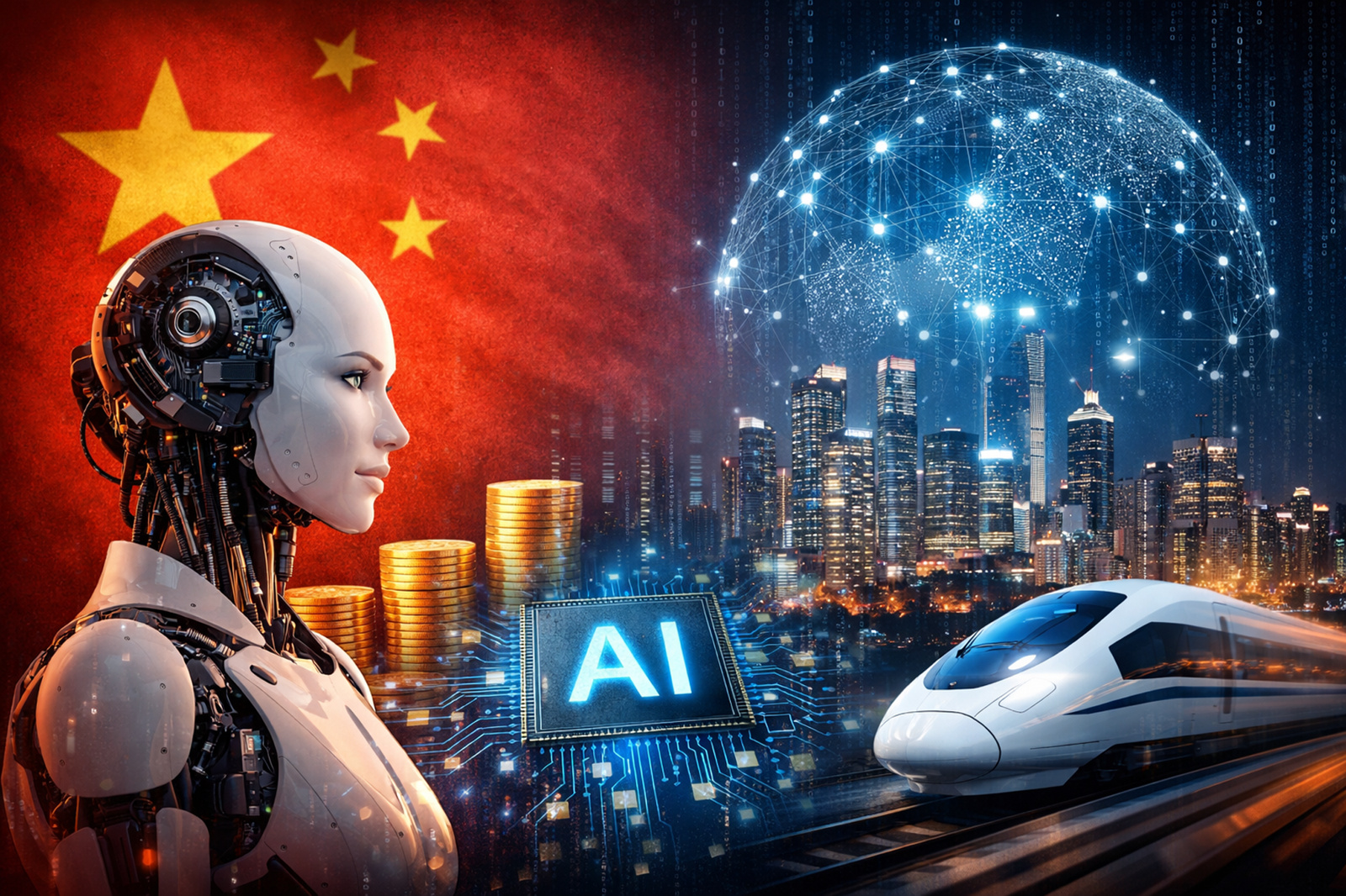 중국의 인공지능(AI) 산업 확대와 기술 경쟁 구도를 상징적으로 표현한 이미지. 챗GPT 생성 이미지