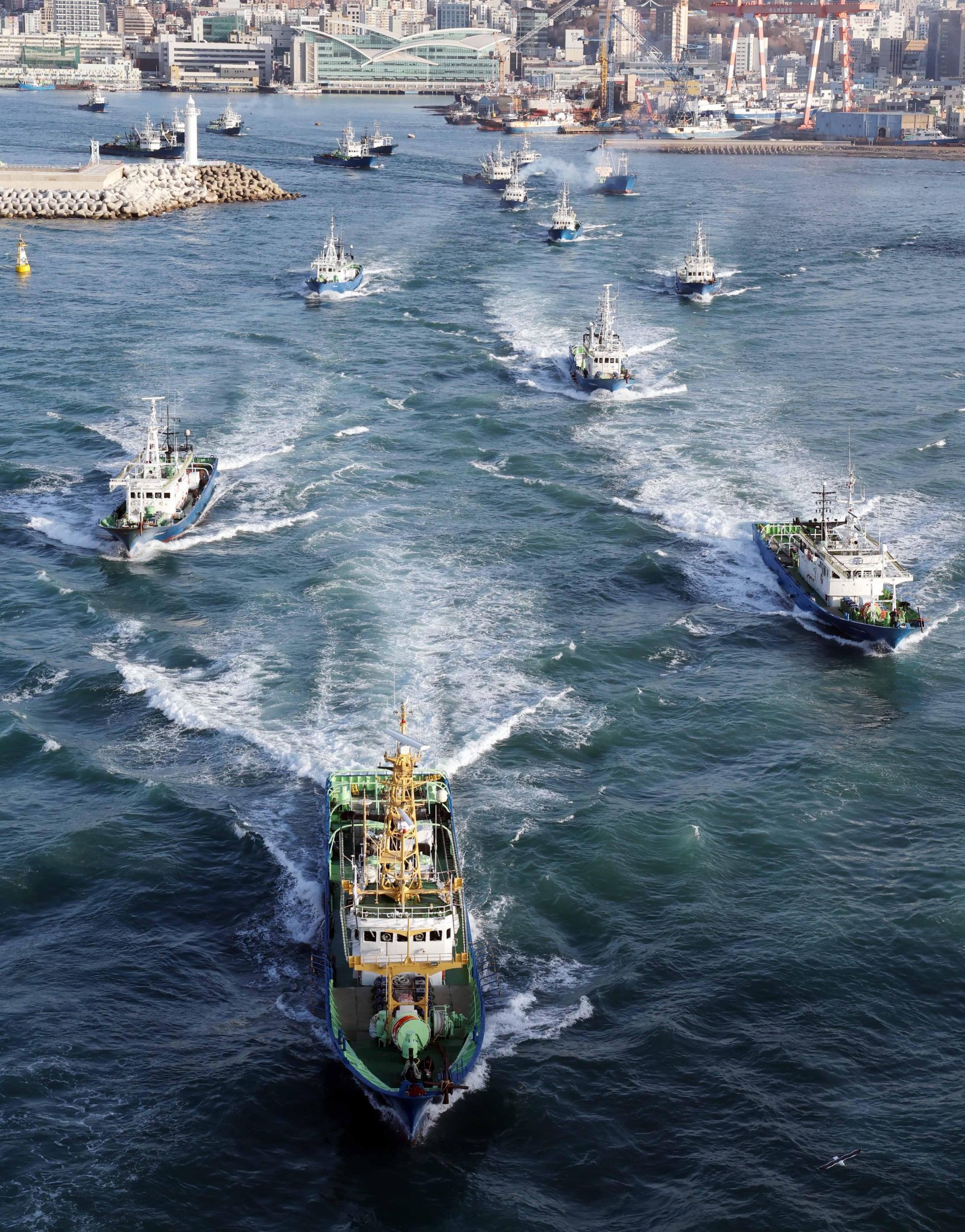 23일 오전 부산 서구 부산공동어시장에서 국내 고등어 어획량의 80% 이상을 차지하는 대형선망수협 소속 16개 선단의 어선들이 조업을 위해 출항하고 있다.