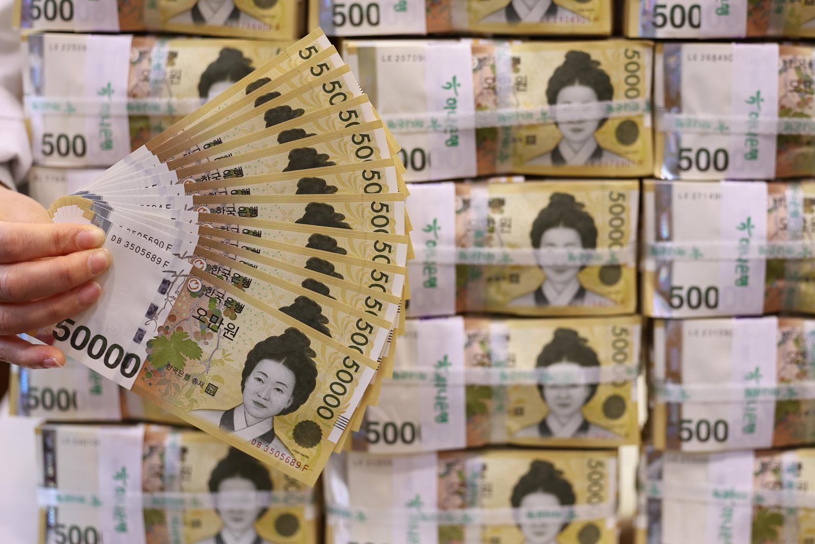 지난달 원화의 실질 가치가 7개월 만에 반등한 것으로 나타난 가운데 24일 오전 서울 중구 하나은행 위변조대응센터에서 관계자가 원화 5만원권 지폐를 정리하고 있다. 이날 한국은행과 국제결제은행(BIS)의 분석에 따르면, 교역 구조와 각국 물가 차이를 반영한 한국의 실질실효환율지수는 올해 1월 기준 86.86(2000년 수준=100)으로 집계됐다. 2026.2.24 뉴스1
