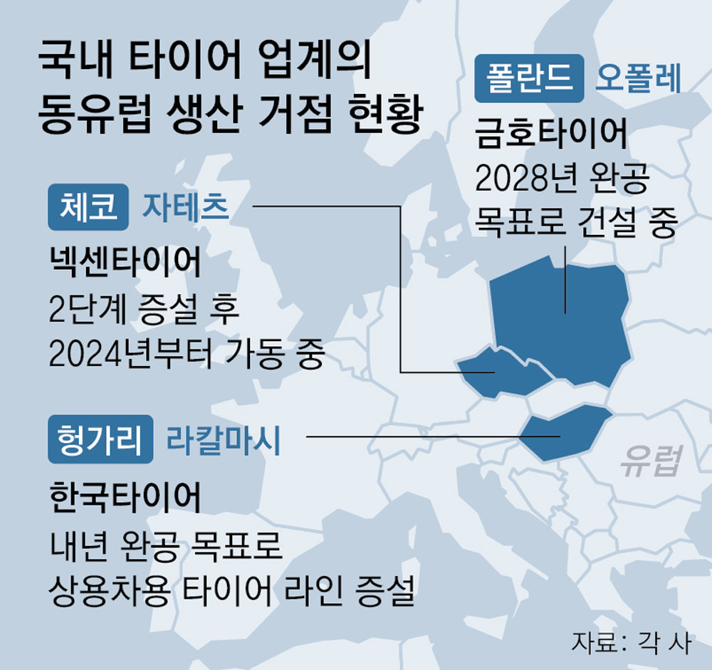 이미 헝가리 라칼마시에 공장을 둔 한국타이어는 내년 완공을 목표로 상용차용 타이어 생산라인을 증설하고 있다. 이번 신규 라인 확장에 약 5억4000만 유로(약 8190억 원)를 투입한다. 넥센타이어도 지난해 기준 약 60%였던 체코 자테츠 공장의 가동률을 올해 100%로 끌어올릴 예정이다.